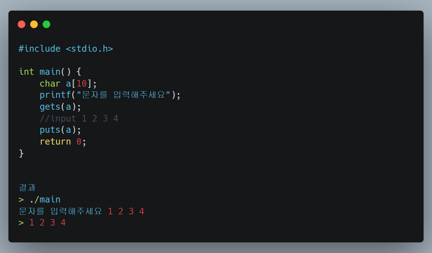 gets함수는 문자열을 입력받을 때 사용하는 함수입니다