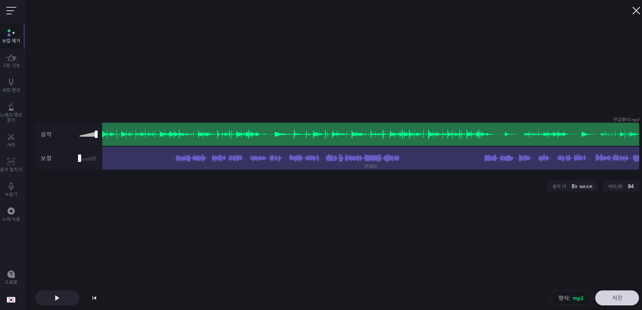단순히 mp3파일을 첨부한 뒤 저장 버튼을 클릭하면 보컬만 따로 저장할지 MR만 따로 저장할지 선택하여 저장할 수 있습니다.