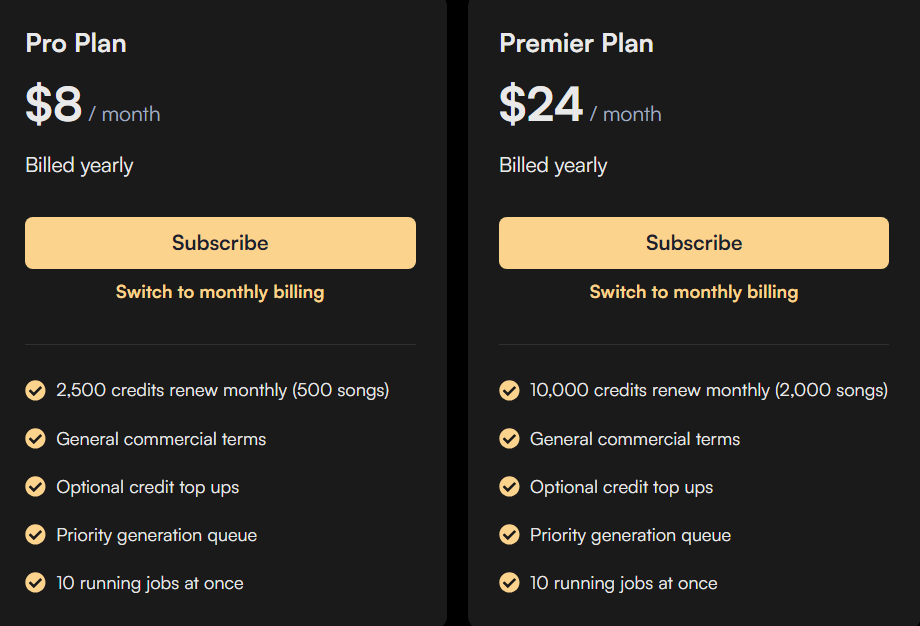 Pro와 Premier Plan은 더 많은 Credits를 제공해줍니다. Free와 다르게 달마다 크레딧을 제공해 주는데 Pro플랜만 구독하더라도 500개 가까이의 음원을 생성할 수 있습니다. 한 번에 생성가능한 음원의 개수도 10개까지 가능하며 일반적인 상업적 용도로 이용가능합니다.