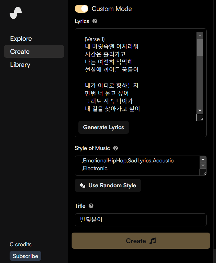 일반모드의 경우 가사만 넣으면 음악이 생성되지만 Custom Mode를 활성화하면 가사 이외에 음악의 스타일이나 제목을 별도로 지정해 줄 수 있어 조금 더 좋은 퀄리티의 음악을 생성할 수 있습니다.