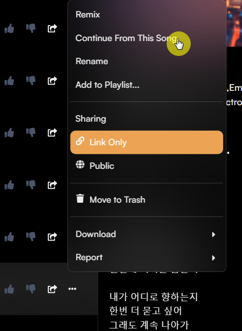 보통 우리가 듣는 음원의 길이는 최소 3분 정도는 되는데 조금 더 길게 음원을 생성하고 싶으면 생성한 음원의 메뉴에서 Continue Form This song을 클릭하면 이어서 새로운 가사로 노래를 작성할 수 있습니다.