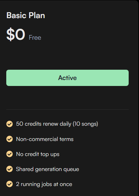 Custom Mode로 한번 음악을 생성할 때 2개의 결과물이 발생하기 때문에 10 Credits이 소요됩니다. 크레딧을 모두 사용하면 다음날 다시 생성해야 합니다.
