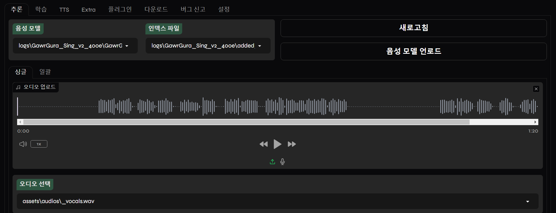 Applio를 실행시킨 뒤 추론탭에서 mp3파일을 업로드하여 원하는 RVC모델을 선택합니다.
