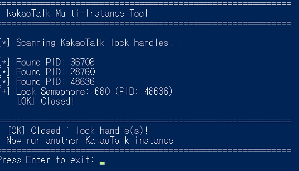 핸들이 닫히면 Semaphore가 사라지고, 새 카카오톡이 실행될 수 있게 됩니다.