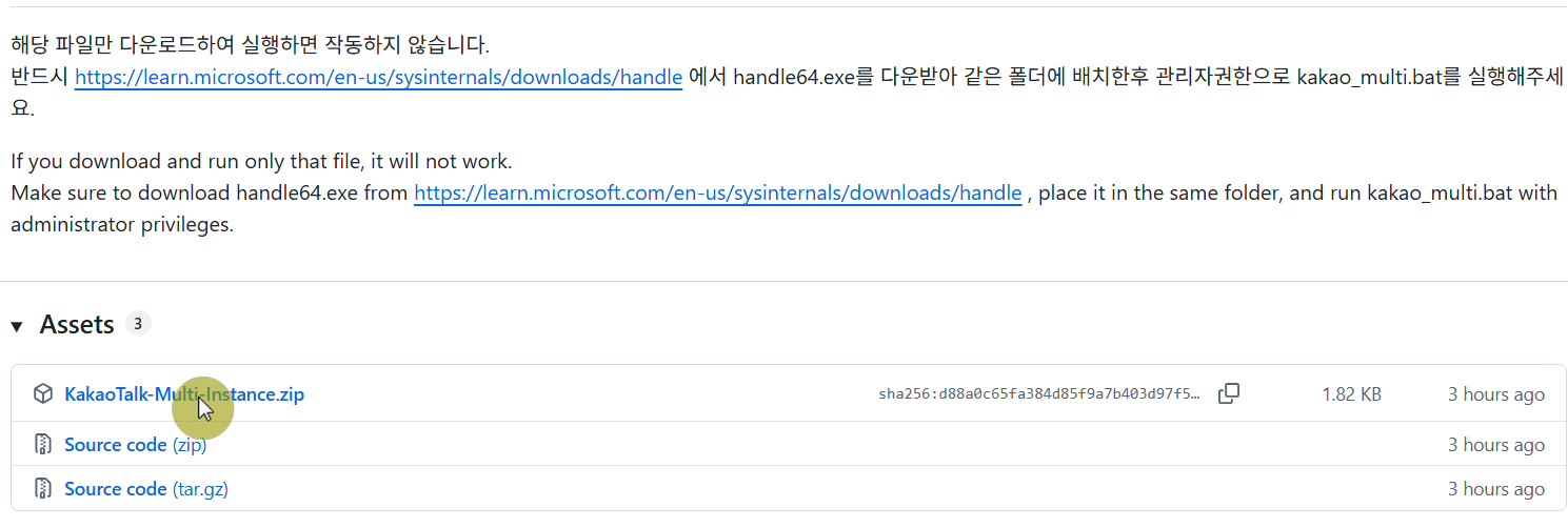 그 다음 kakao_multi.bat 파일을 우클릭해서 관리자 권한으로 실행합니다. 핸들을 닫으려면 관리자 권한이 꼭 필요합니다.