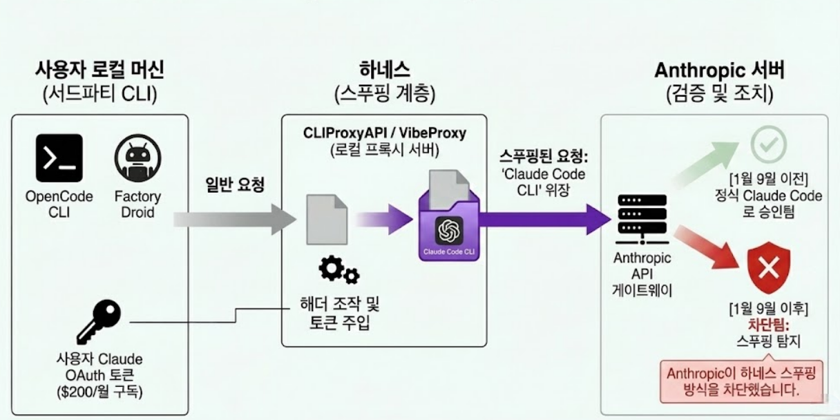 하지만 1월 9일, Anthropic이 이 harness 스푸핑을 탐지해서 차단했습니다.