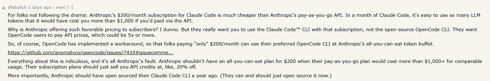 한 Hacker News 유저(dfabulich)의 계산에 따르면, Claude Code로 한 달 열심히 쓰면 API 종량제로 환산했을 때 $1,000이 넘는 토큰을 쉽게 소비할 수 있다고 합니다. 그걸 $200에 무제한으로 쓸 수 있었으니, Anthropic 입장에서는 출혈이 심했던 겁니다.