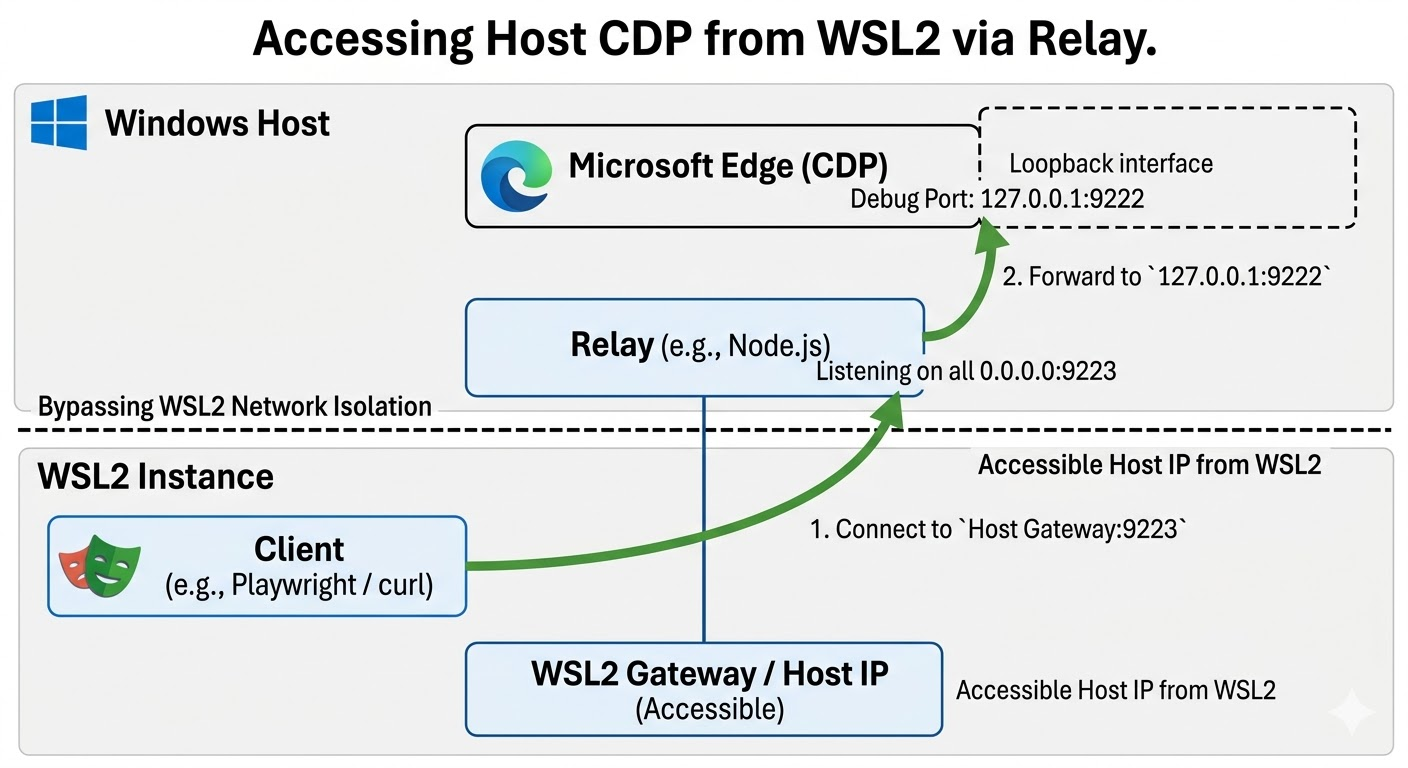 앞에서 WSL2의 네트워크 격리 때문에 CDP가 안 된다고 했는데, Node.js relay를 하나 끼우면 우회할 수 있습니다. 원리는 간단합니다. Windows에서 0.0.0.0:9223으로 리슨하는 relay 서버를 띄워서, WSL2에서 오는 요청을 127.0.0.1:9222(Edge의 디버그 포트)로 전달하는 겁니다.