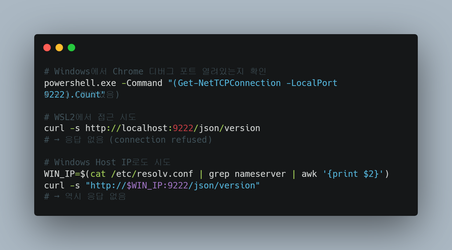 Windows에서 Chrome을 디버그 모드로 띄워놓으면 localhost:9222에 포트가 열립니다. 그런데 WSL2에서 curl localhost:9222를 날리면 이게 Windows의 9222가 아니라 WSL2 VM 안의 9222로 갑니다. 당연히 아무것도 없으니 connection refused가 뜹니다.
