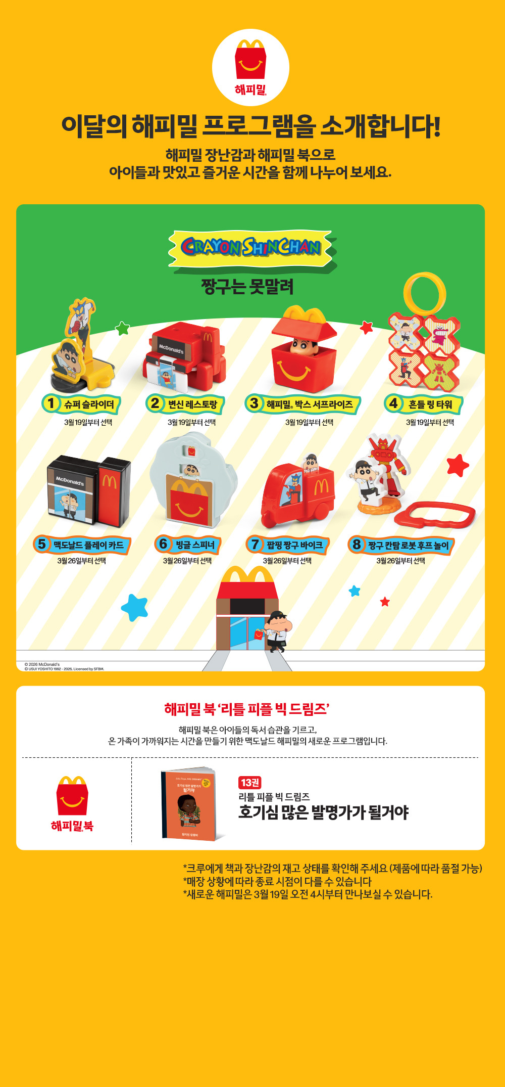 매달 새로운 즐거움을 선사하는 맥도날드 해피밀! 지난 2월에는 플레이모빌(PLAYMOBIL) 시리즈와 함께하셨나요? 아쉬워할 틈도 없이, 2026년 3월에는 더욱 특별한 시리즈가 우리를 기다리고 있습니다. 바로 아이 어른 할 것 없이 모두에게 사랑받는 캐릭터, 짱구는 못말려(CRAYON SHINCHAN)입니다!